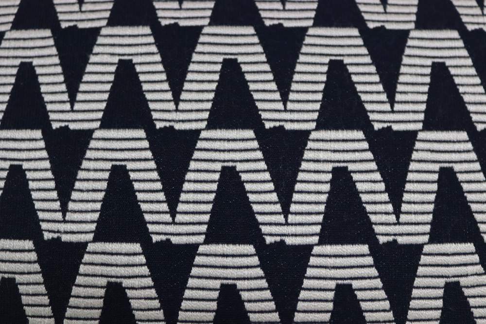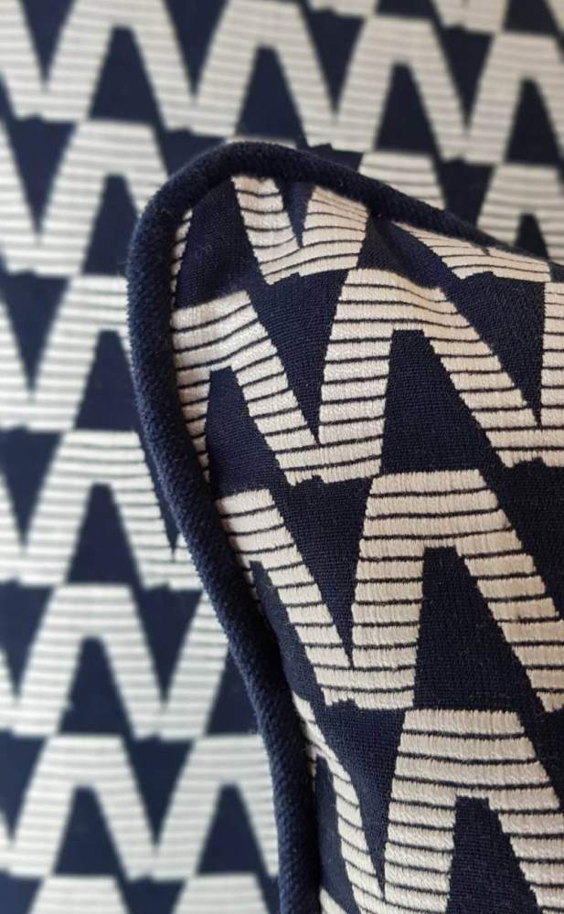 Striking, graphic and reminiscent of stacked dominos. Finished with a bold liquorice piping to accentuate the spohistication of the fabric. Piped in liquorice navy. Composition 63% Viscose, 24%, Cotton, 13% Polyester.